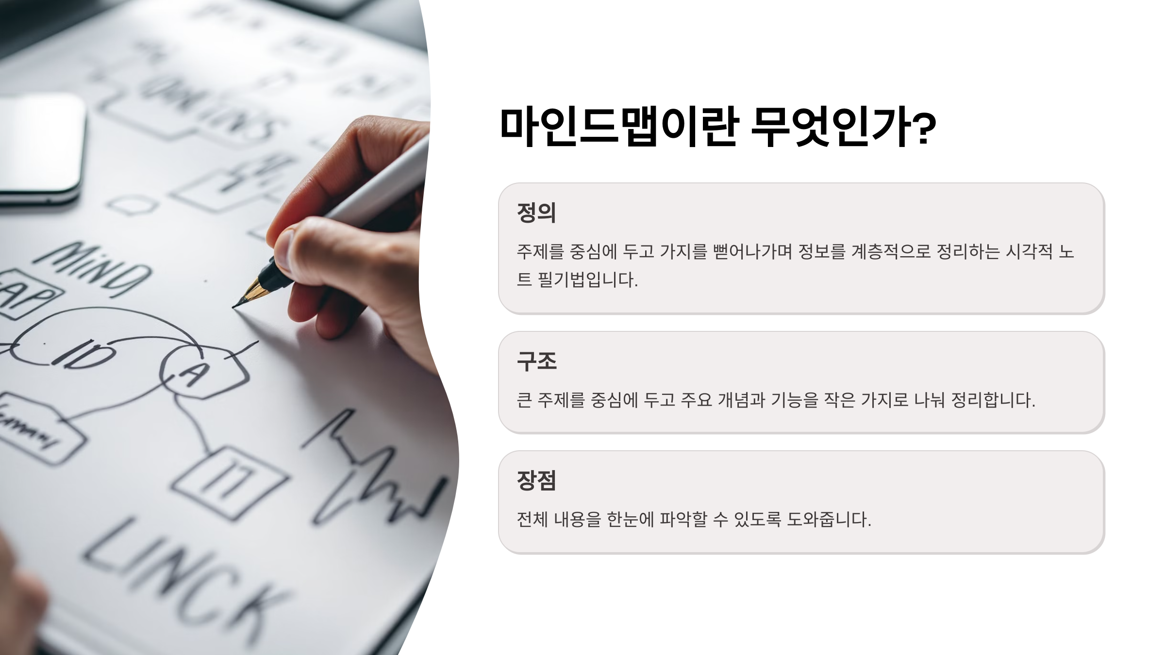 마인드맵은 주제를 중심에 두고 가지를 뻗어나가면서 정보를 계층적으로 정리하는 시각적 노트 필기법입니다. 예를 들어, "인체"라는 큰 주제를 중심에 두고 주요 기관과 각각의 기능을 작은 가지로 나눠 정리할 수 있습니다. 이처럼 정보를 계층적으로 확장해가면서 전체 내용을 한눈에 파악할 수 있도록 도와줍니다.
