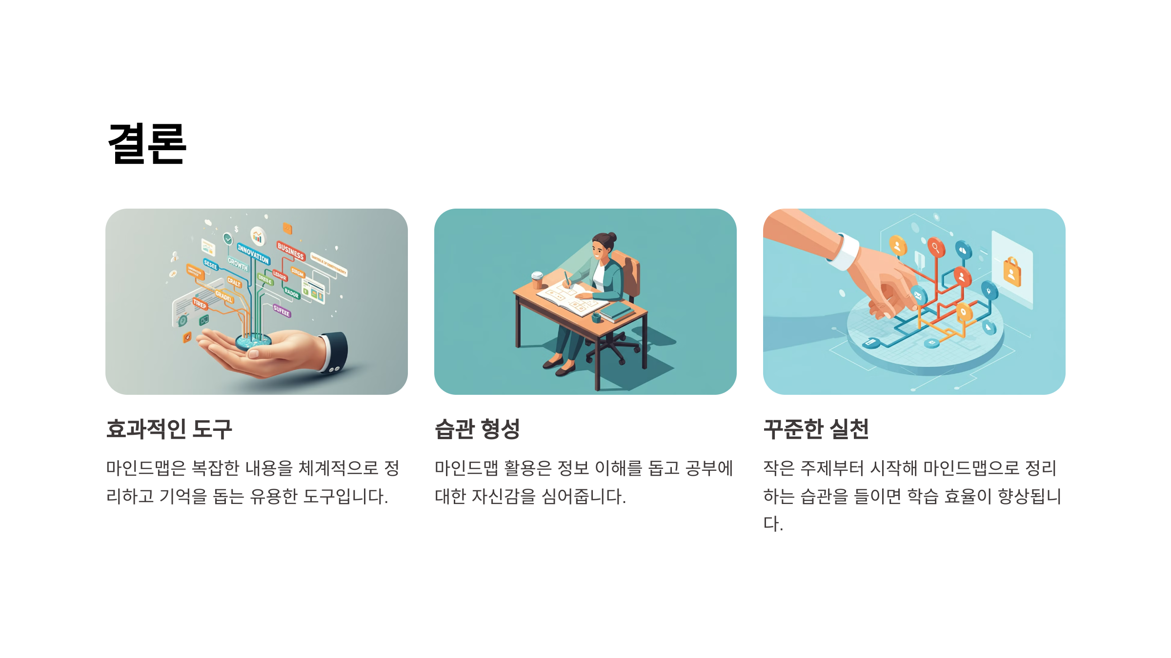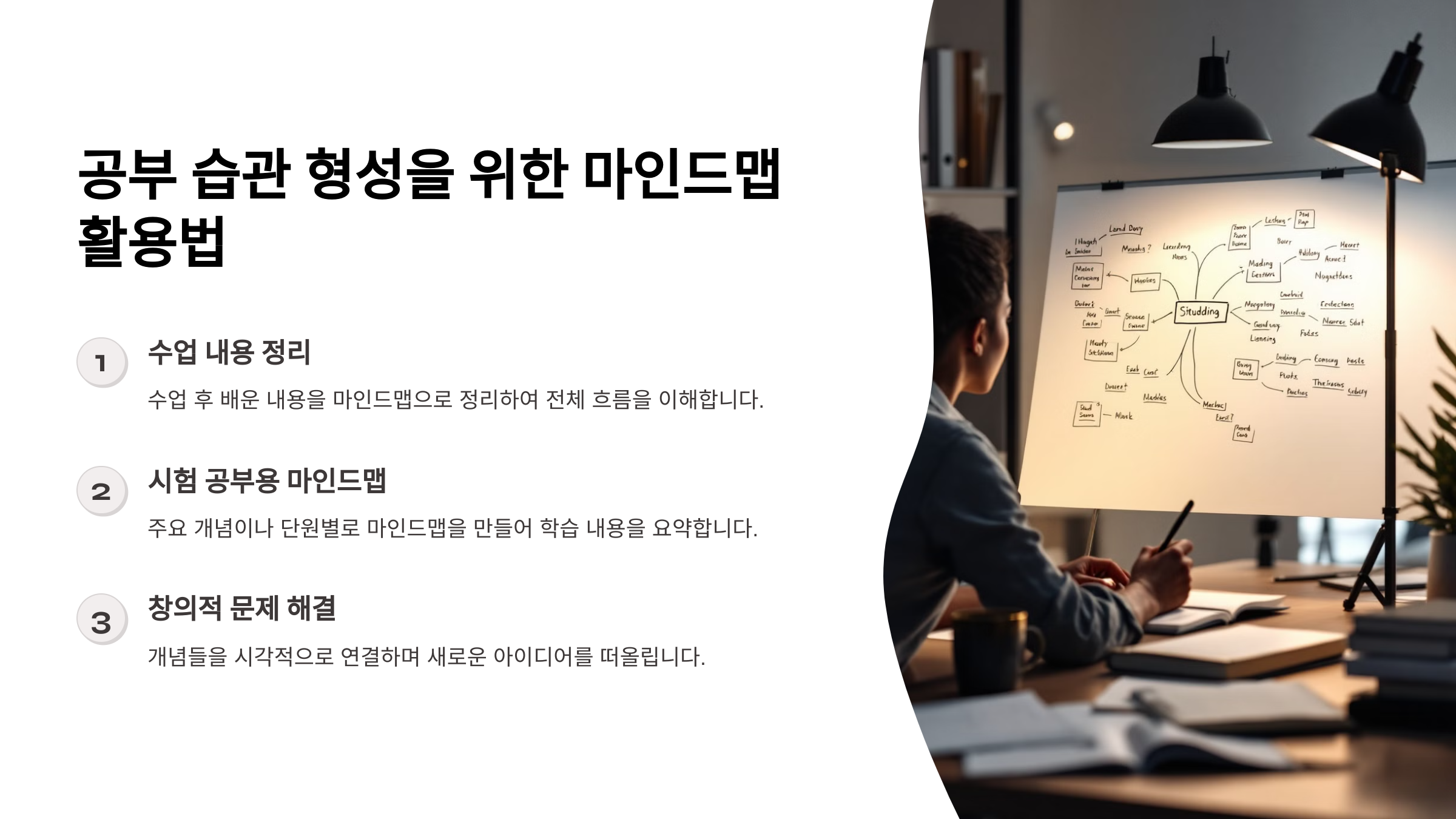 마인드맵은 복잡한 내용을 체계적으로 정리하고 기억을 돕는 매우 유용한 도구입니다. 공부 습관을 형성하기 위해 마인드맵을 활용하는 것은 정보의 이해를 돕고, 나아가 공부에 대한 자신감을 심어줄 수 있습니다. 작은 주제부터 시작해 마인드맵으로 정리하는 습관을 들여보세요. 꾸준히 실천한다면, 학습 효율은 물론 공부 습관도 탄탄해질 것입니다.