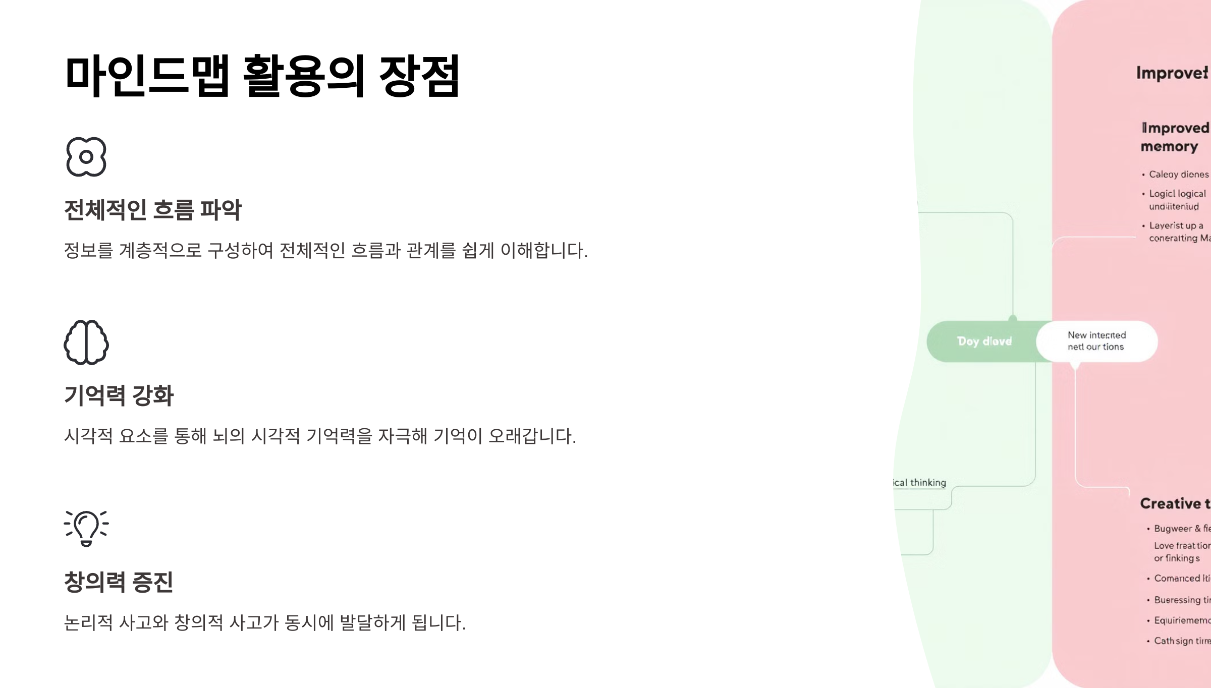 3) 창의적 문제 해결 능력 향상: 마인드맵을 작성하면서 개념들을 시각적으로 연결해보면, 새로운 아이디어를 떠올리는 데 도움이 됩니다. 문제 해결을 위한 창의적 접근 방식이 자연스럽게 습관화될 수 있습니다.