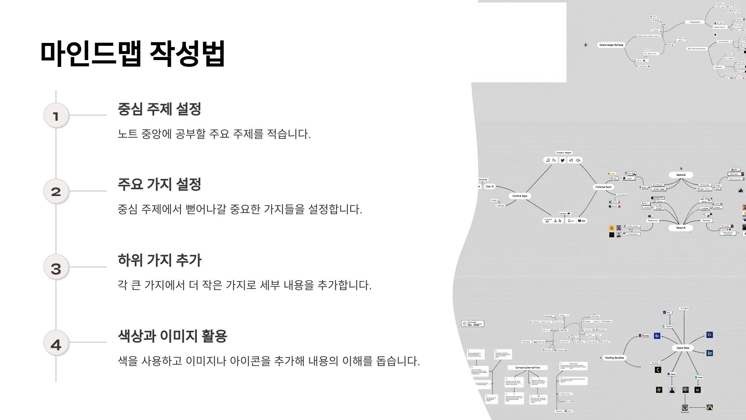 마인드맵은 정보를 구조적으로 나누어 시각적으로 배치하는 것이 핵심입니다. 다음은 마인드맵을 작성하는 구체적인 단계입니다:
