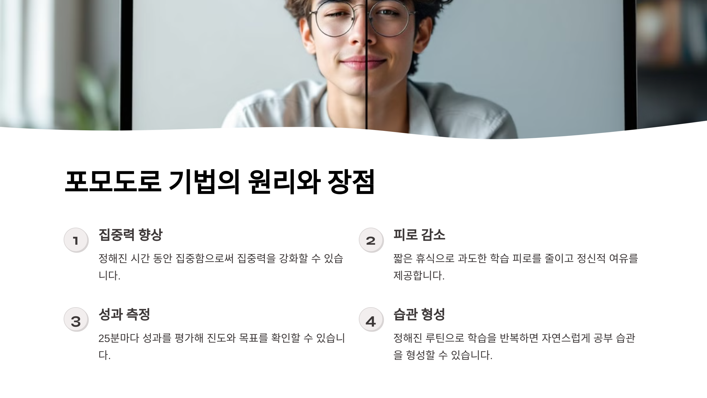 포모도로 기법은 짧은 시간 동안 집중해서 일하는 것을 목표로 합니다. 인간의 집중력은 일정 시간 이상 지속되기 어렵기 때문에, 짧게 집중하고 잠시 쉬는 방식이 효율적입니다. 이 방식을 통해 학습 피로가 줄어들고, 집중력을 더 오랜 시간 유지할 수 있습니다.