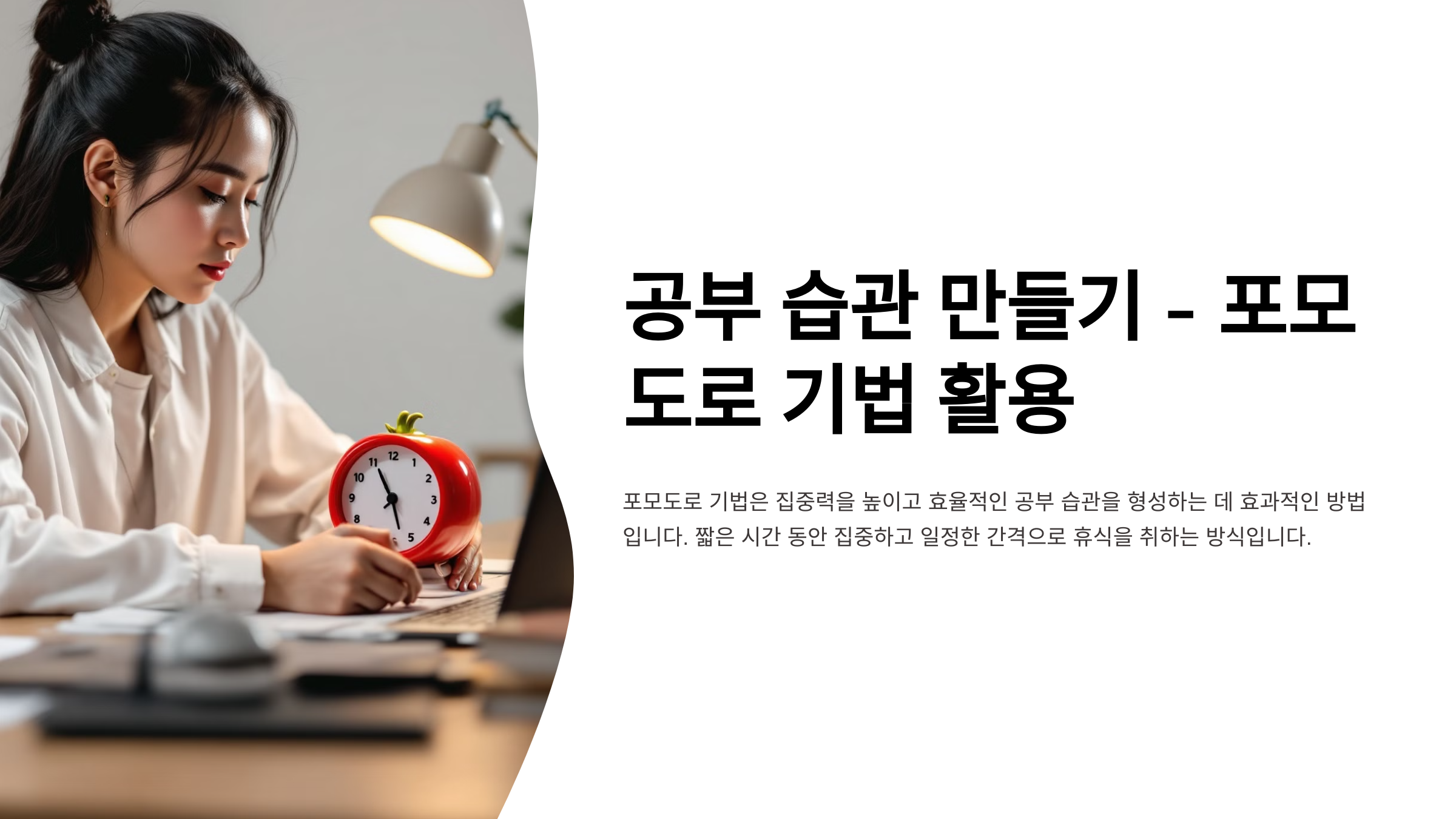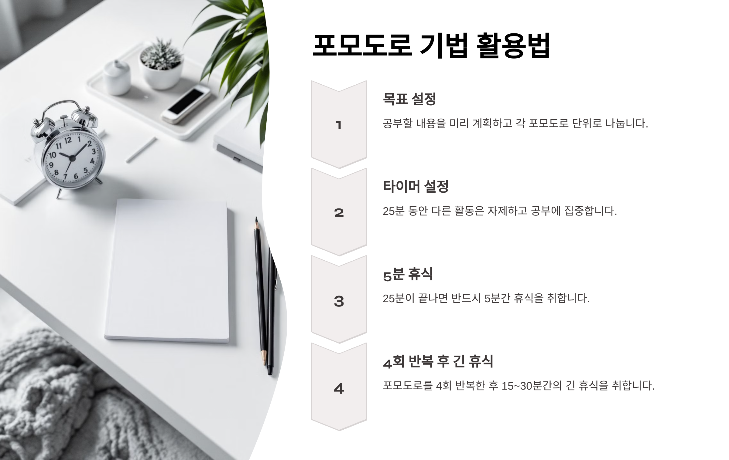 포모도로 기법은 짧은 시간 동안 집중해서 일하고, 일정한 간격으로 휴식 시간을 갖는 방식으로, 집중력을 높이고 효율적인 공부 습관을 형성하는 데 매우 효과적인 방법입니다. 여기서는 포모도로 기법의 원리와 구체적인 활용 방법을 소개하고, 이를 통해 공부 습관을 만들 수 있는 방법을 제안하겠습니다.