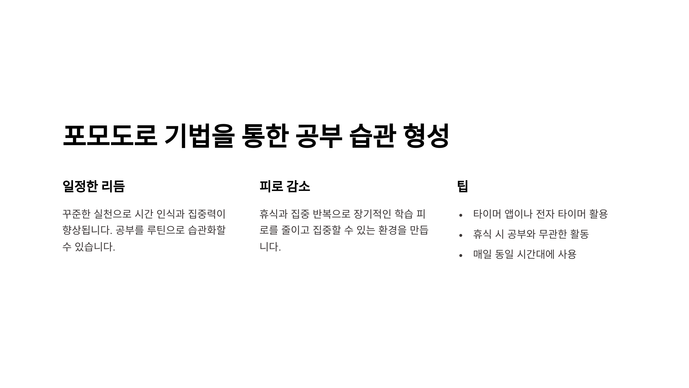- 매일 동일한 시간대에 포모도로 기법을 사용해 습관으로 정착시키세요.