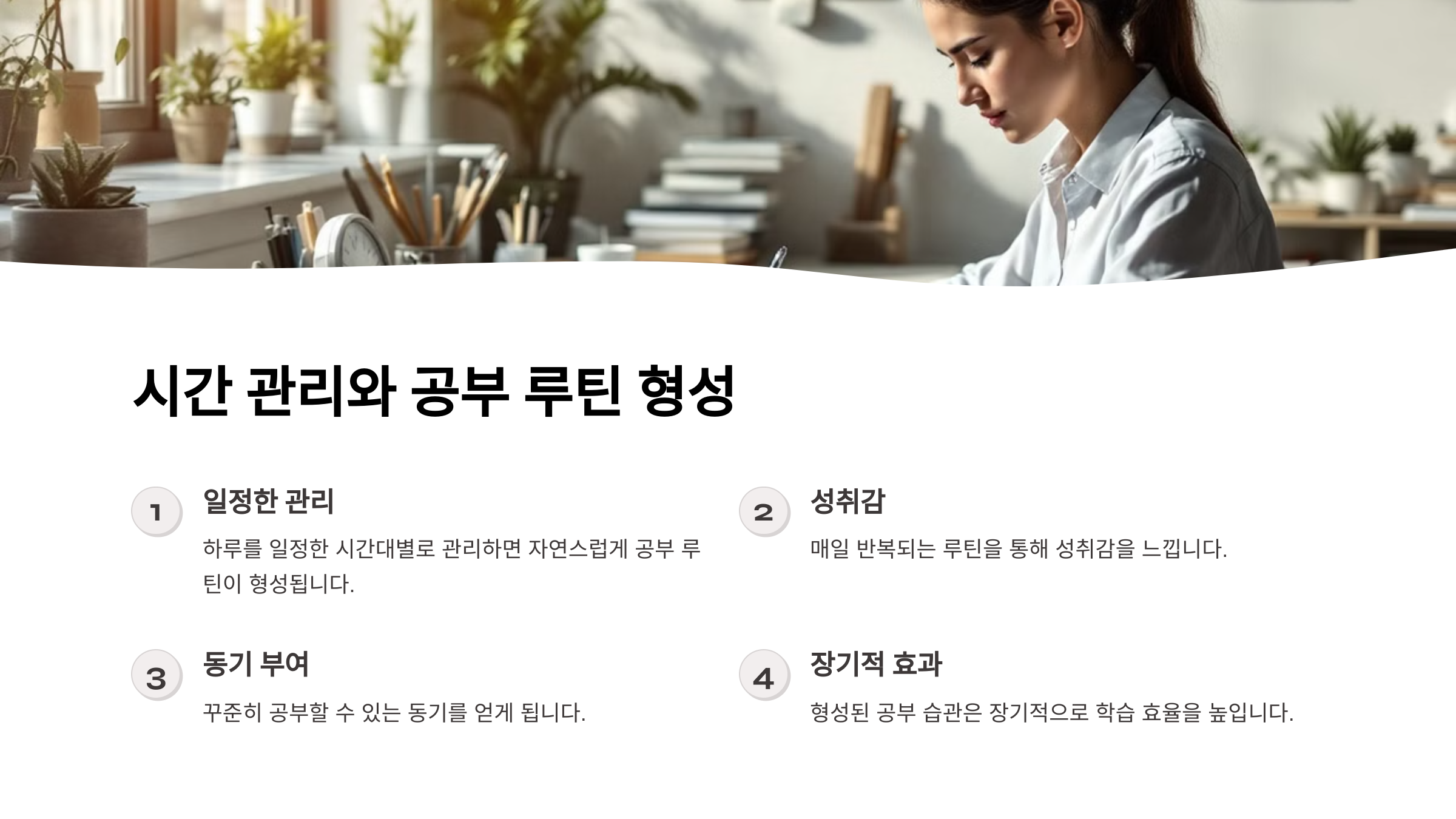 위에서 언급한 방법들을 적용해, 하루를 일정한 시간대별로 관리하면 자연스럽게 공부 루틴이 형성됩니다. 매일 반복되는 루틴을 통해 성취감을 느끼고, 꾸준히 공부할 수 있는 동기도 얻게 됩니다. 이렇게 형성된 공부 습관은 시험 기간뿐 아니라 장기적으로 학습 효율을 높이는 데 큰 도움이 됩니다.