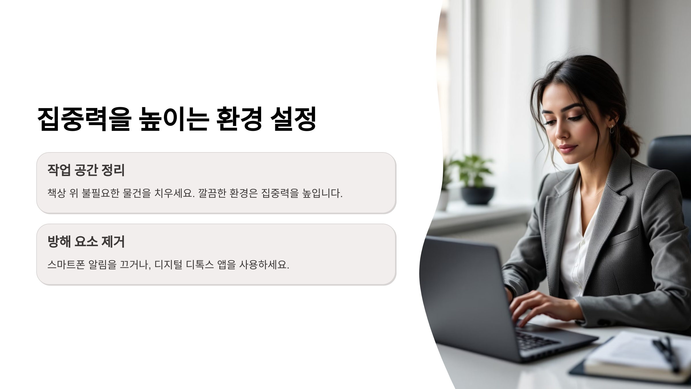 - 작업 공간 정리: 책상 위의 불필요한 물건을 치우고, 공부에 필요한 도구만 배치하세요. 깔끔한 환경이 집중력을 높입니다.