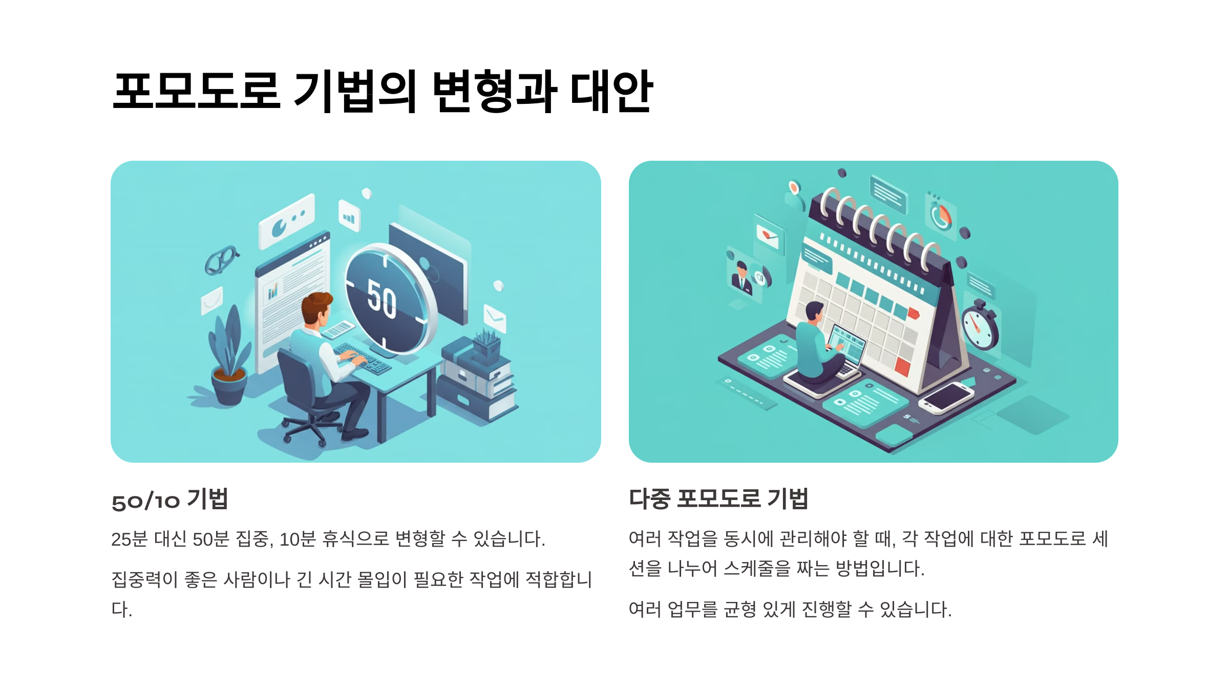 25분 대신 50분 집중, 10분 휴식 같은 변형된 기법을 사용할 수도 있습니다. 집중력이 좋은 사람이나 긴 시간 몰입이 필요한 작업에 적합합니다.