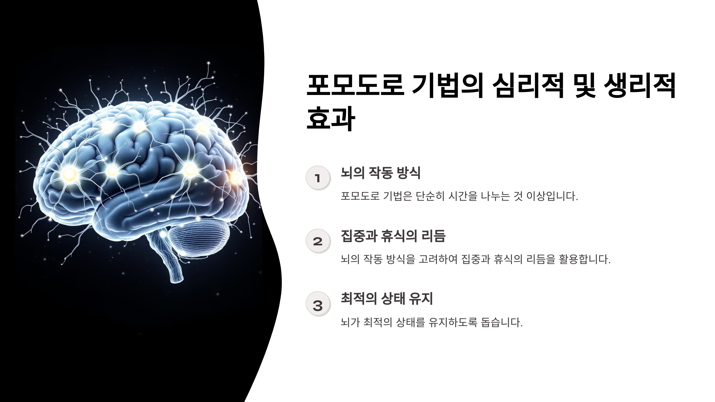 포모도로 기법이 단순히 시간을 나누는 것 이상인 이유는 뇌의 작동 방식과 관련이 있습니다. 집중과 휴식의 리듬을 활용해 뇌가 최적의 상태를 유지할 수 있도록 돕습니다.