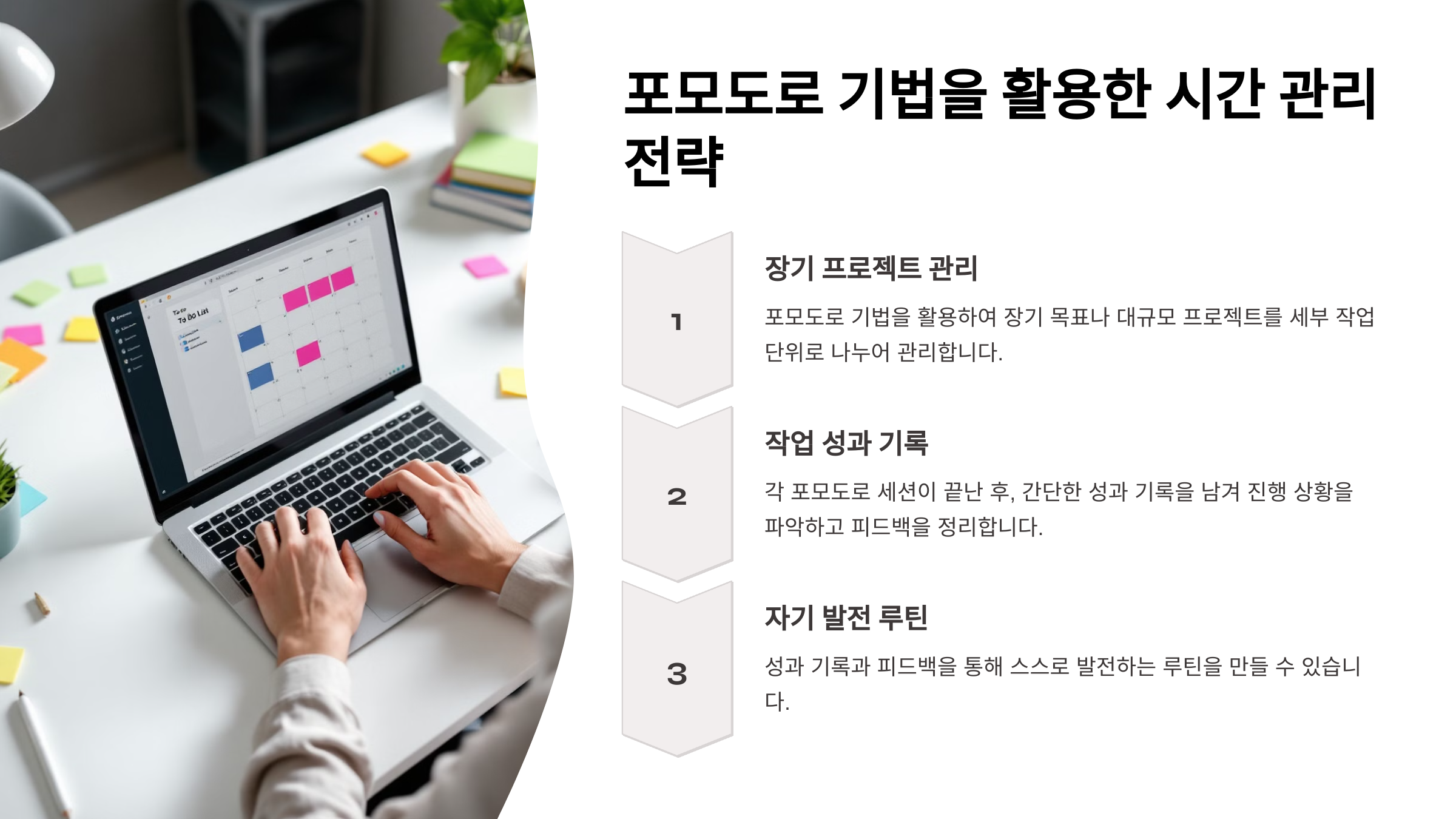 장기적인 목표나 대규모 프로젝트를 다룰 때는 포모도로 기법을 활용해 작업을 나누어 관리해 보세요. 예를 들어, 리서치, 데이터 분석, 글쓰기 등 세부 작업을 포모도로 세션 단위로 분할하여 체계적으로 진행할 수 있습니다.