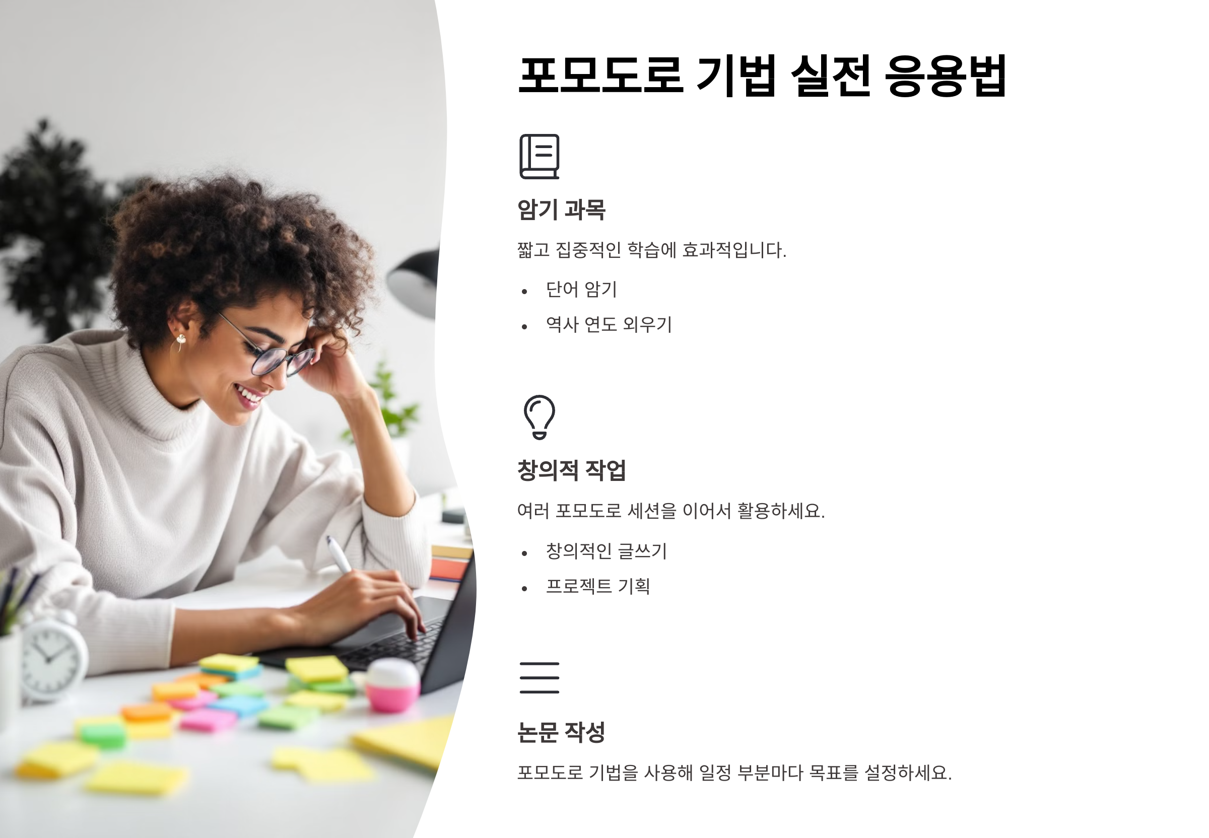 포모도로 기법은 다양한 상황에 맞게 적용할 수 있습니다. 학습 내용이나 업무 성격에 따라 유연하게 응용해 보세요.