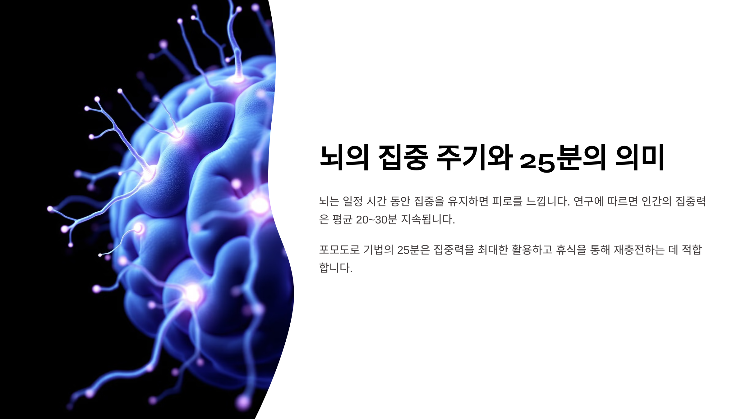 ➡ 핵심: 25분간 몰입하면 뇌는 짧은 시간에 높은 효율을 발휘합니다.