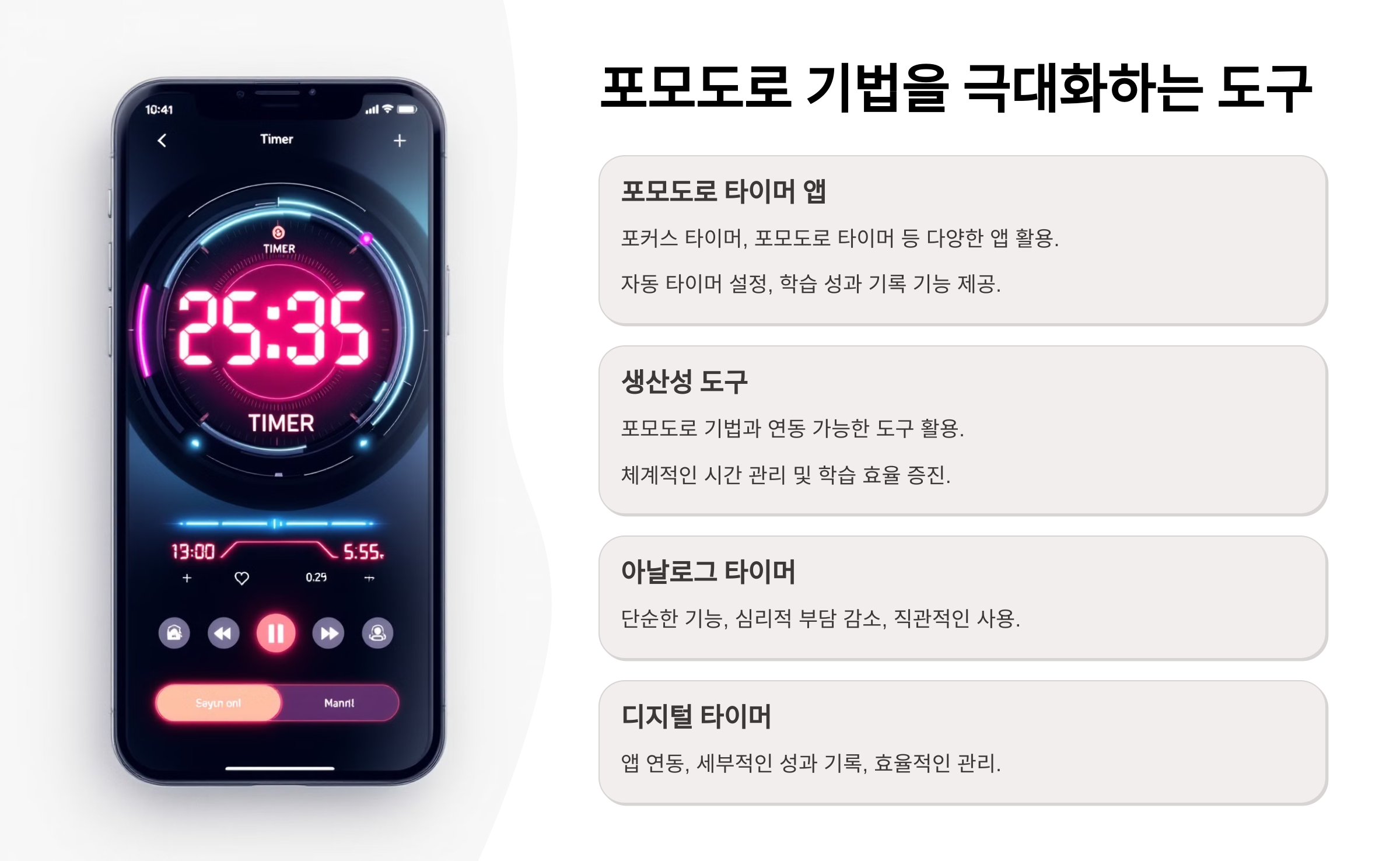 효율적인 학습을 위해 도구를 잘 활용하는 것도 중요합니다. 다양한 포모도로 타이머 앱이 도움이 될 수 있습니다.