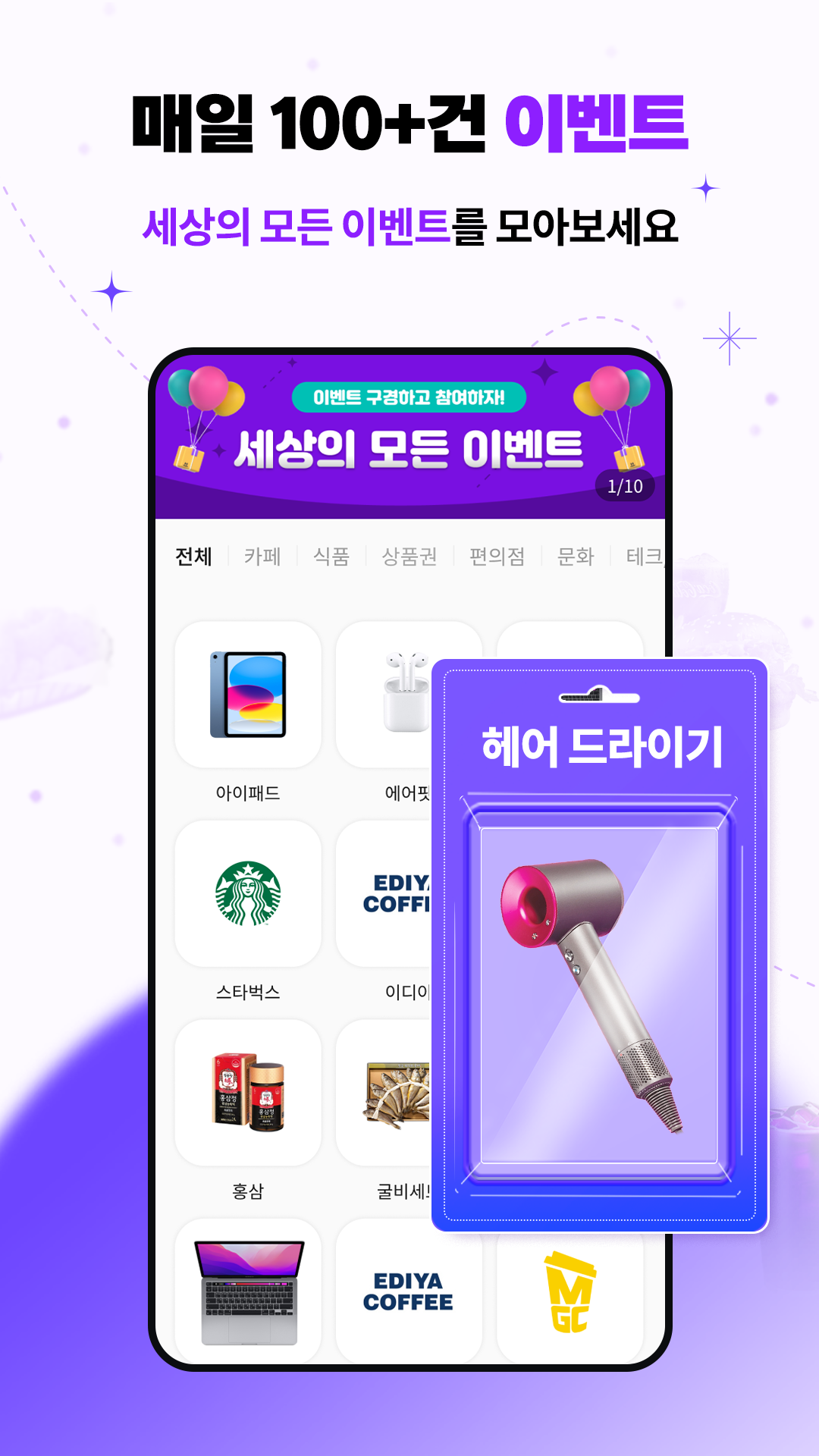 스타벅스 기프티콘부터 다이슨, 아이패드, 포인트 응모까지 다양합니다.