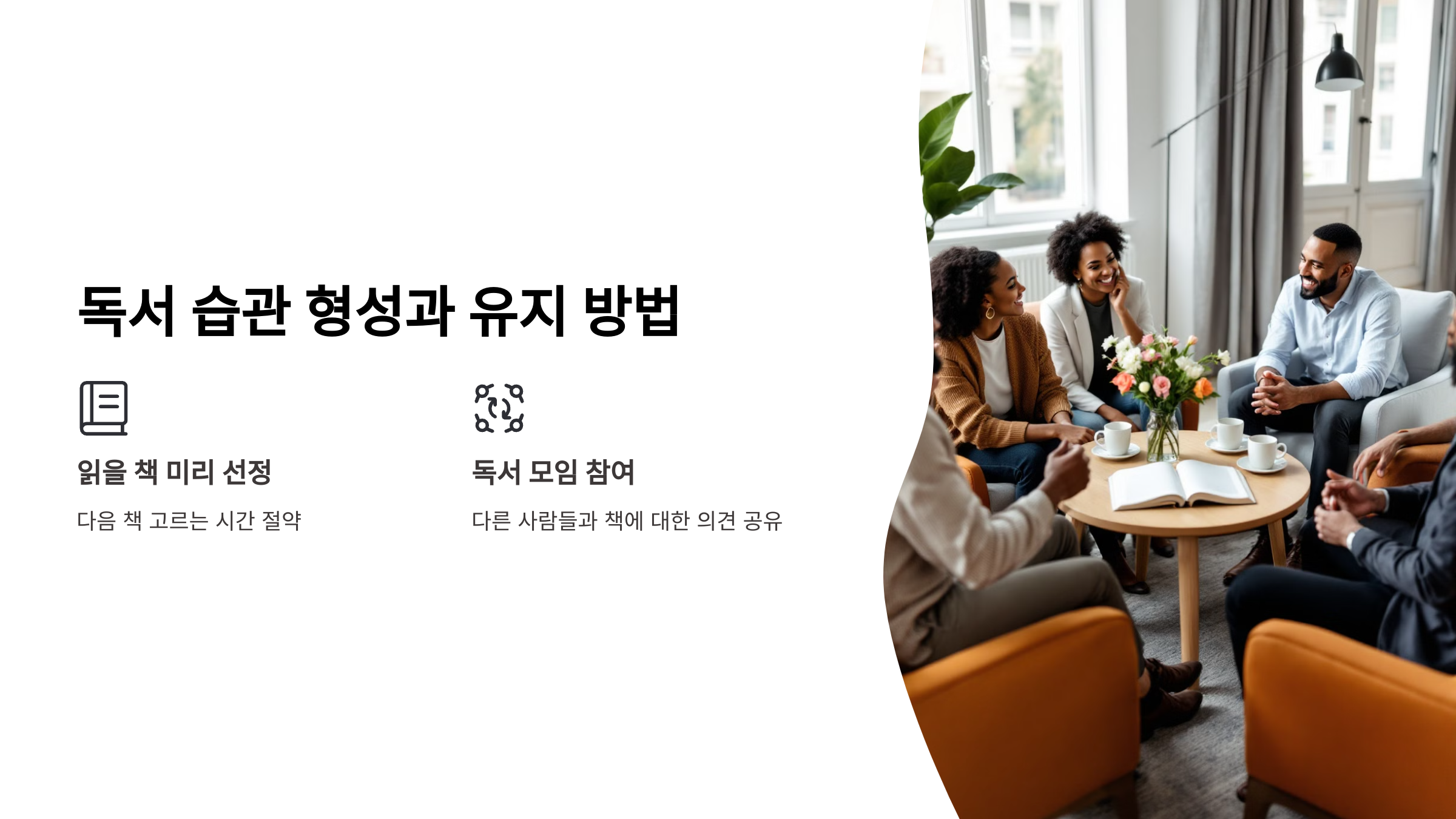 Q3: 독서 습관을 꾸준히 유지하는 팁이 있나요?A3: 작은 목표부터 시작하는 것이 중요합니다. 하루에 몇 쪽이라도 읽는 습관을 길러보세요. 또한 독서 모임에 참여하면 꾸준히 독서를 이어나갈 수 있는 동기부여가 됩니다.