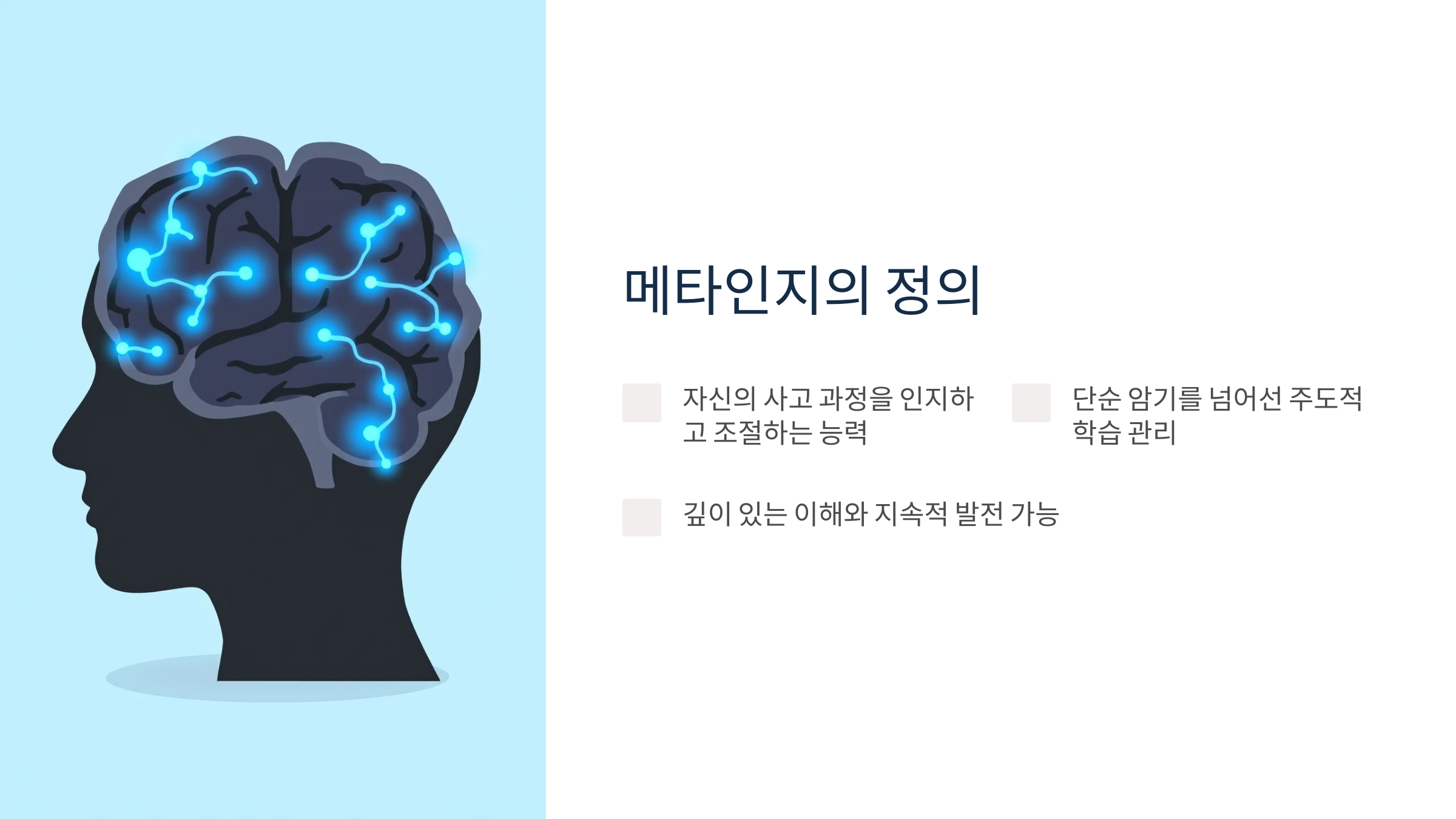 메타인지란 자신의 사고 과정을 스스로 인지하고, 조절하는 능력을 의미합니다. 쉽게 말해 "내가 무엇을 알고, 무엇을 모르는지"를 판단하고 이에 따라 학습 방법을 조정하는 것이죠.