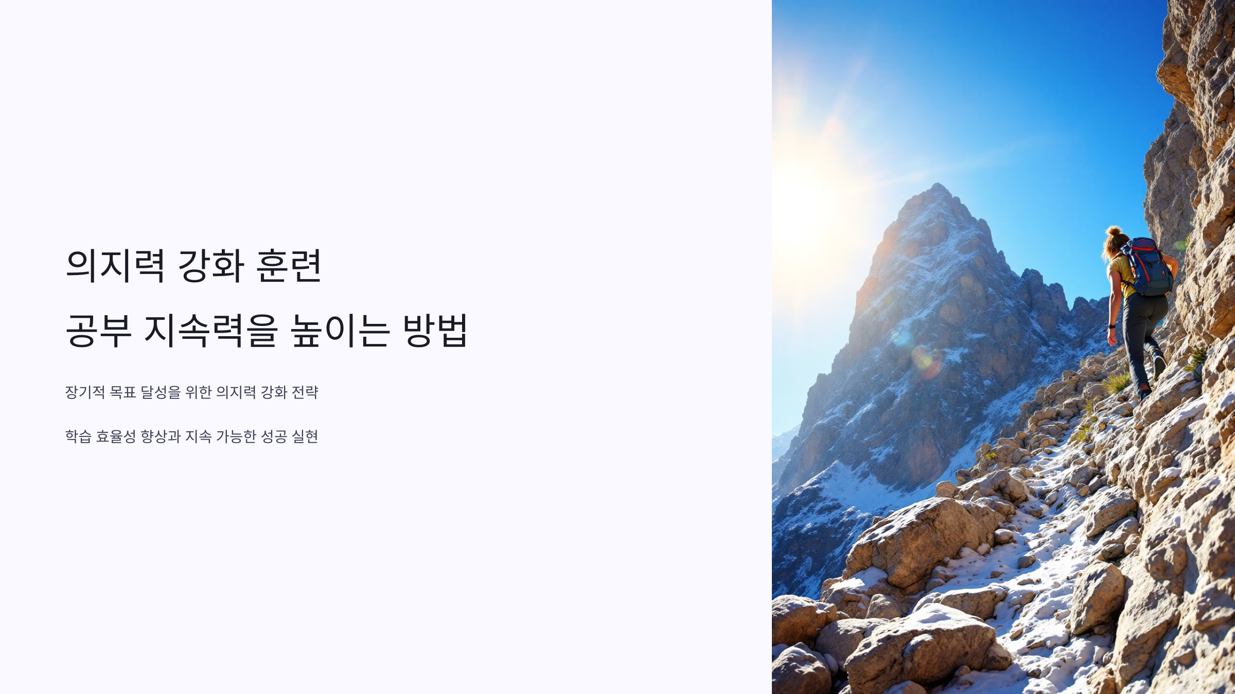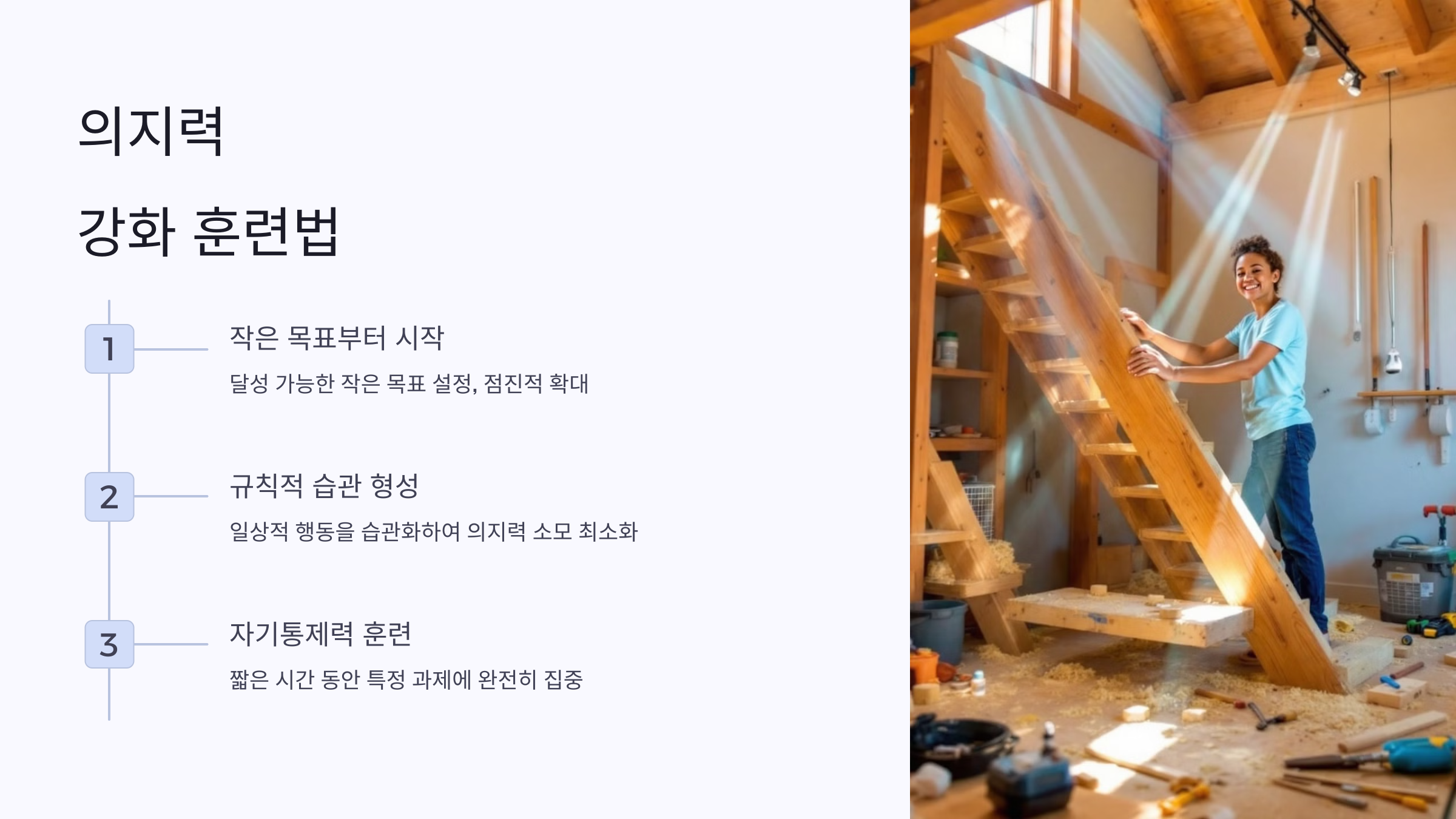 의지력은 점진적으로 강화됩니다. 처음부터 큰 목표를 세우기보다는 작고 달성 가능한 목표를 세우세요. 예: "하루 10분 집중해서 공부하기"를 시작으로 점차 시간을 늘려가는 방식.