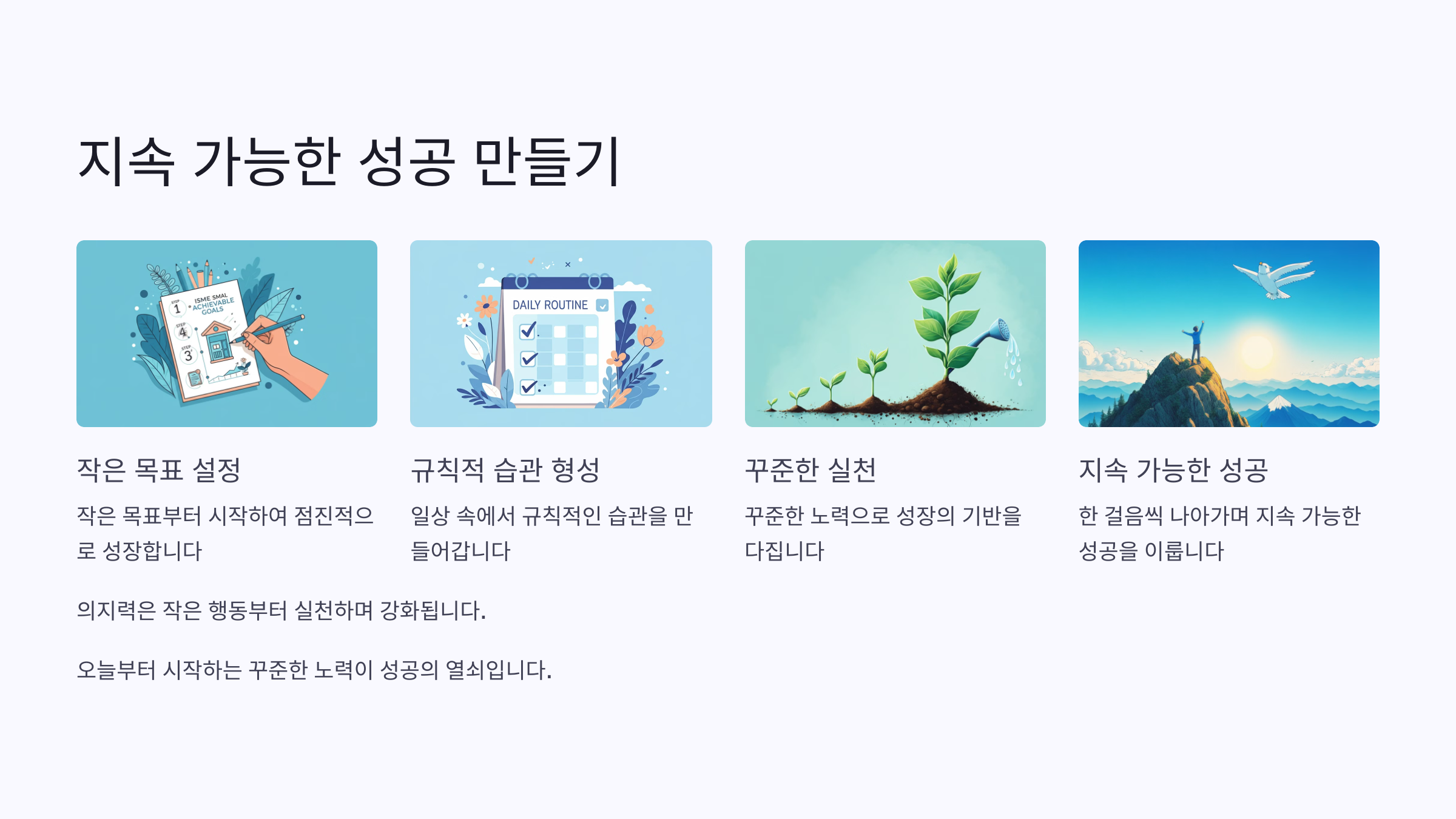 의지력은 단순한 결심 이상의 힘을 발휘하며, 작은 행동부터 실천하는 연습을 통해 강화됩니다. 오늘부터라도 작은 목표를 세우고, 규칙적인 습관을 만들어 의지력을 키워보세요. 꾸준한 노력은 지속 가능한 성공으로 이어질 것입니다.