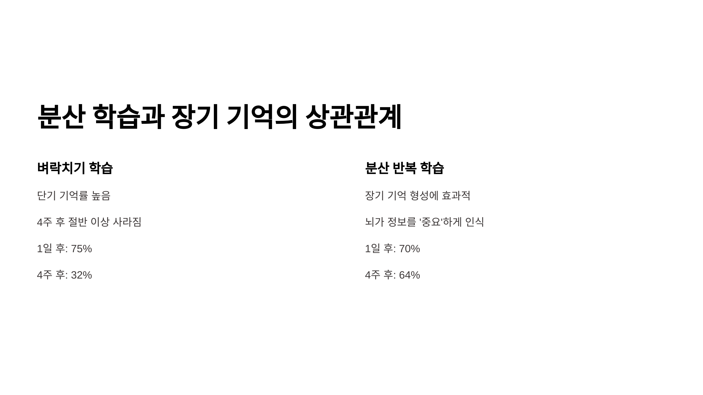 벼락치기 학습은 짧은 시간에 많은 내용을 익히려는 방식으로, 시험 직전에는 효과적으로 보일 수 있습니다. 하지만 뇌는 과부하 상태에서 정보를 장기 기억으로 전환하는 데 한계가 있습니다. 실제 연구 결과에 따르면, 벼락치기로 학습한 경우 단기 기억률은 높지만 시간이 지나면 빠르게 잊혀지며, 4주 후에는 절반 이상이 사라진다고 합니다.