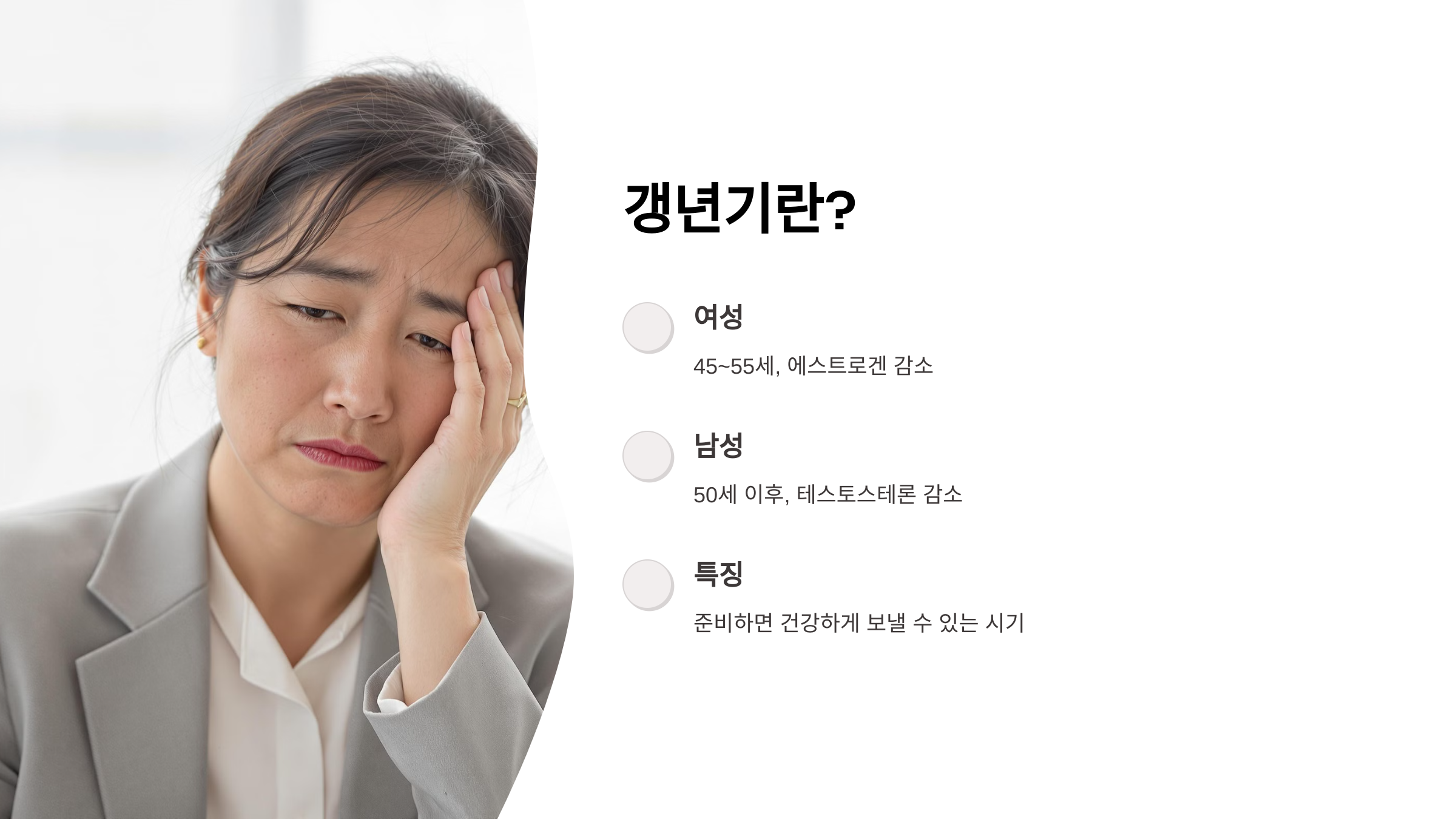 갱년기는 여성은 보통 45세~55세 사이, 남성은 50세 이후에 시작되는 호르몬 변화 시기입니다. 여성은 에스트로겐 감소, 남성은 테스토스테론 감소로 인해 다양한 신체·정신적 증상이 나타나게 되죠.