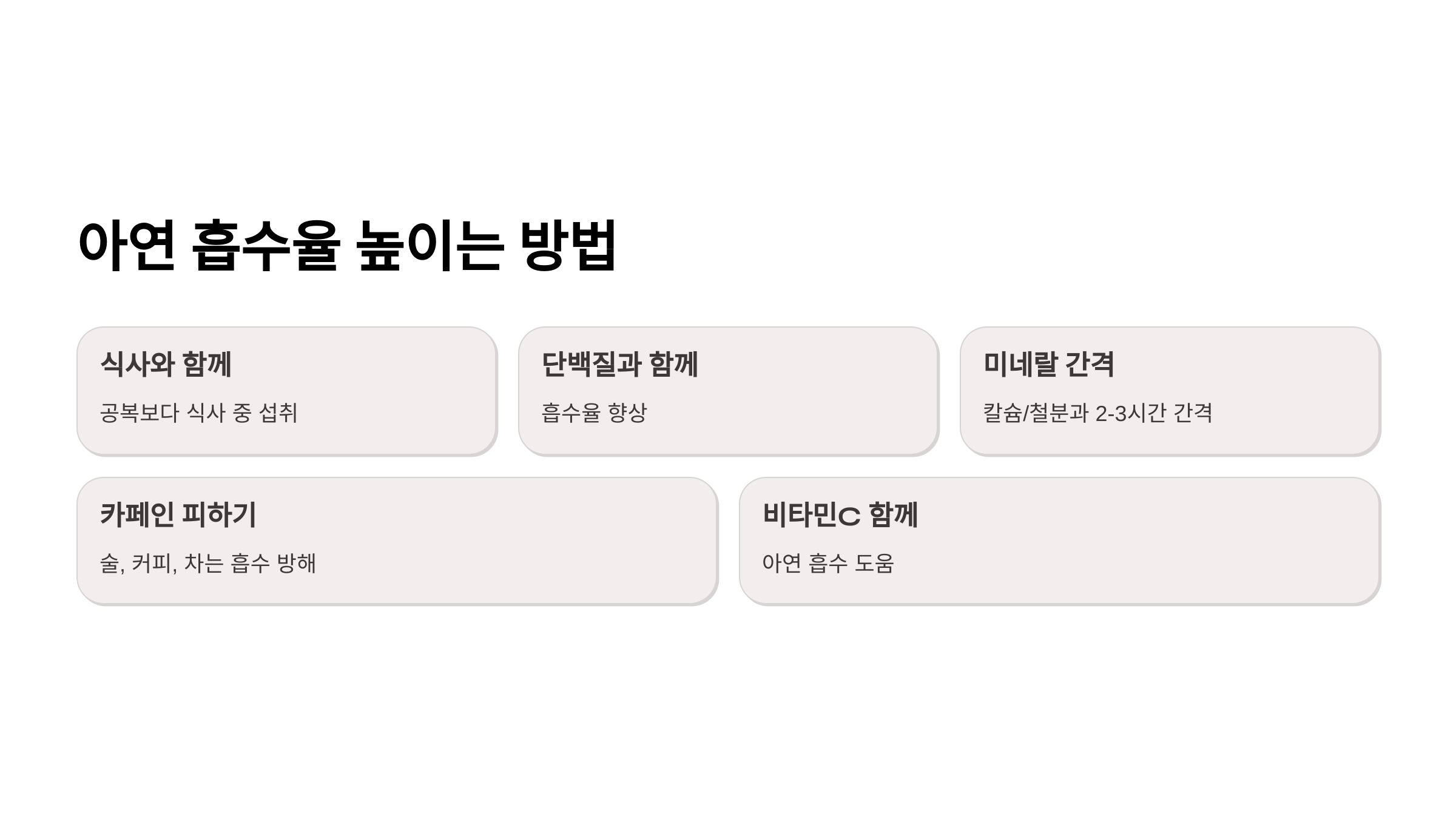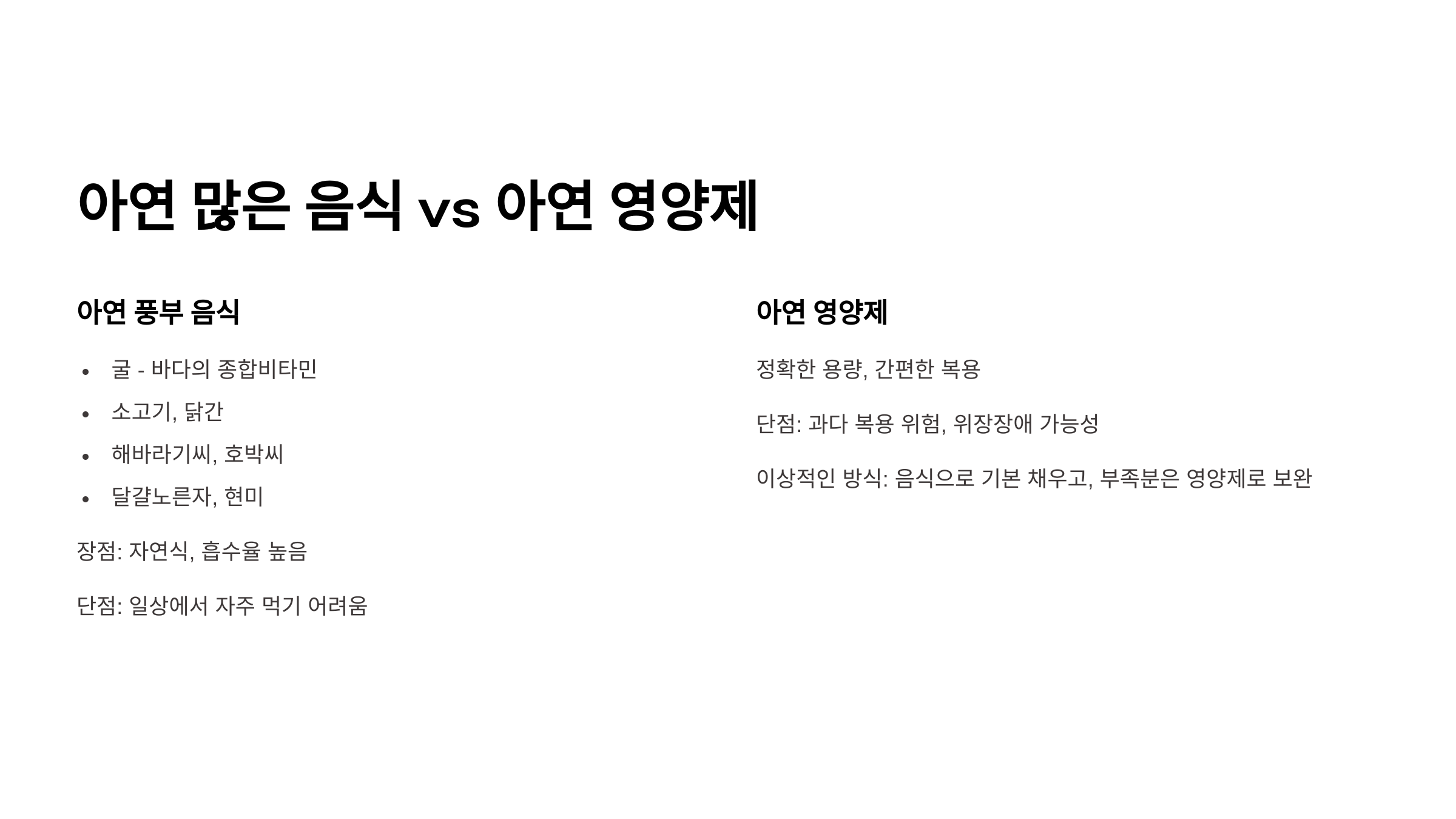 | 아연 음식 | 자연식, 흡수율 높음 | 일상에서 자주 먹기 어려움 |