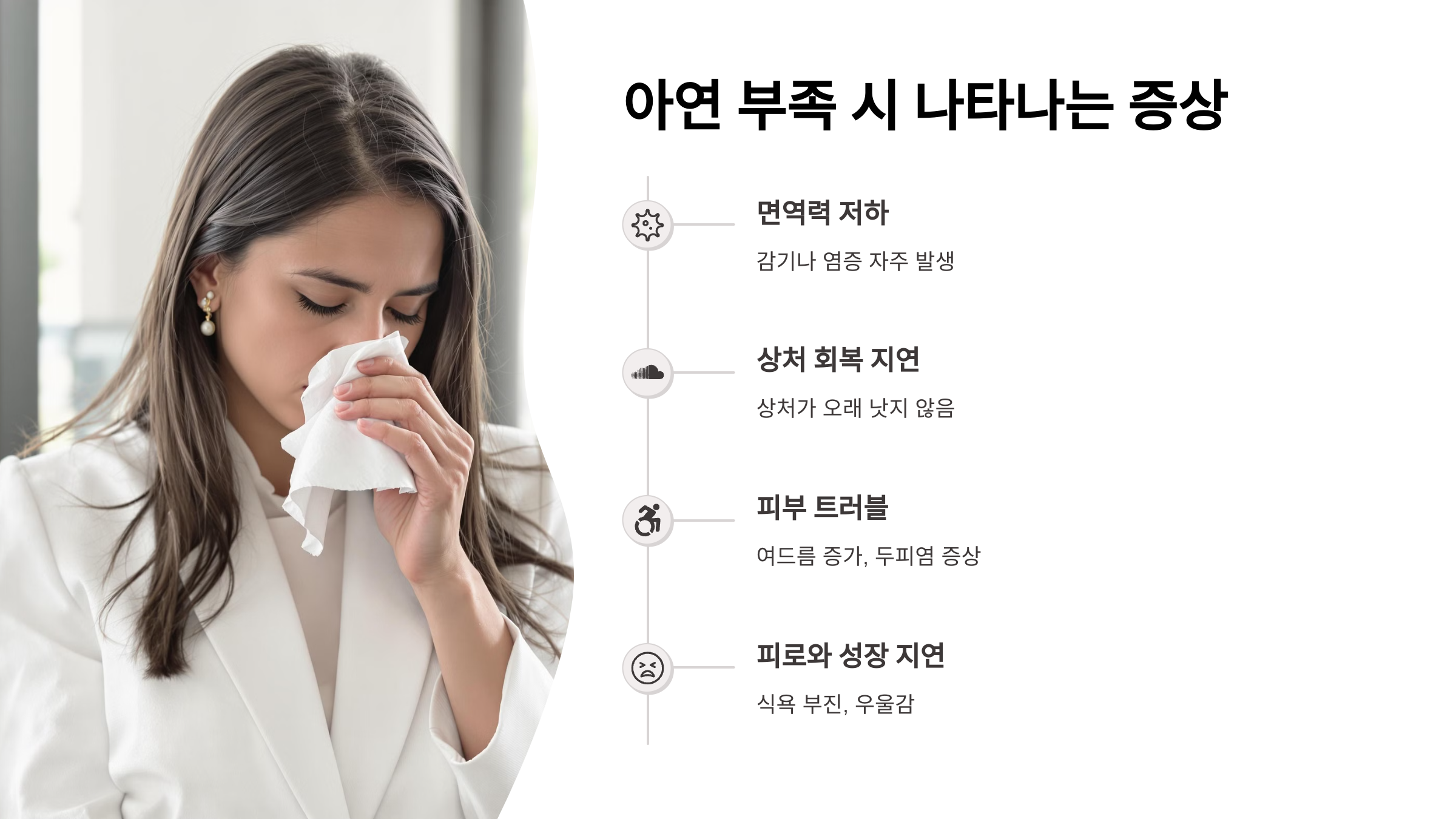 아연이 부족하면 신체 곳곳에서 이상 신호가 나타납니다. 대표적으로 감기에 자주 걸리고, 상처가 잘 낫지 않으며, 피부 트러블이 심해질 수 있어요. 특히 아이들은 성장 지연, 성인 남성은 성기능 저하, 여성은 생리불순 등으로 이어질 수 있답니다.