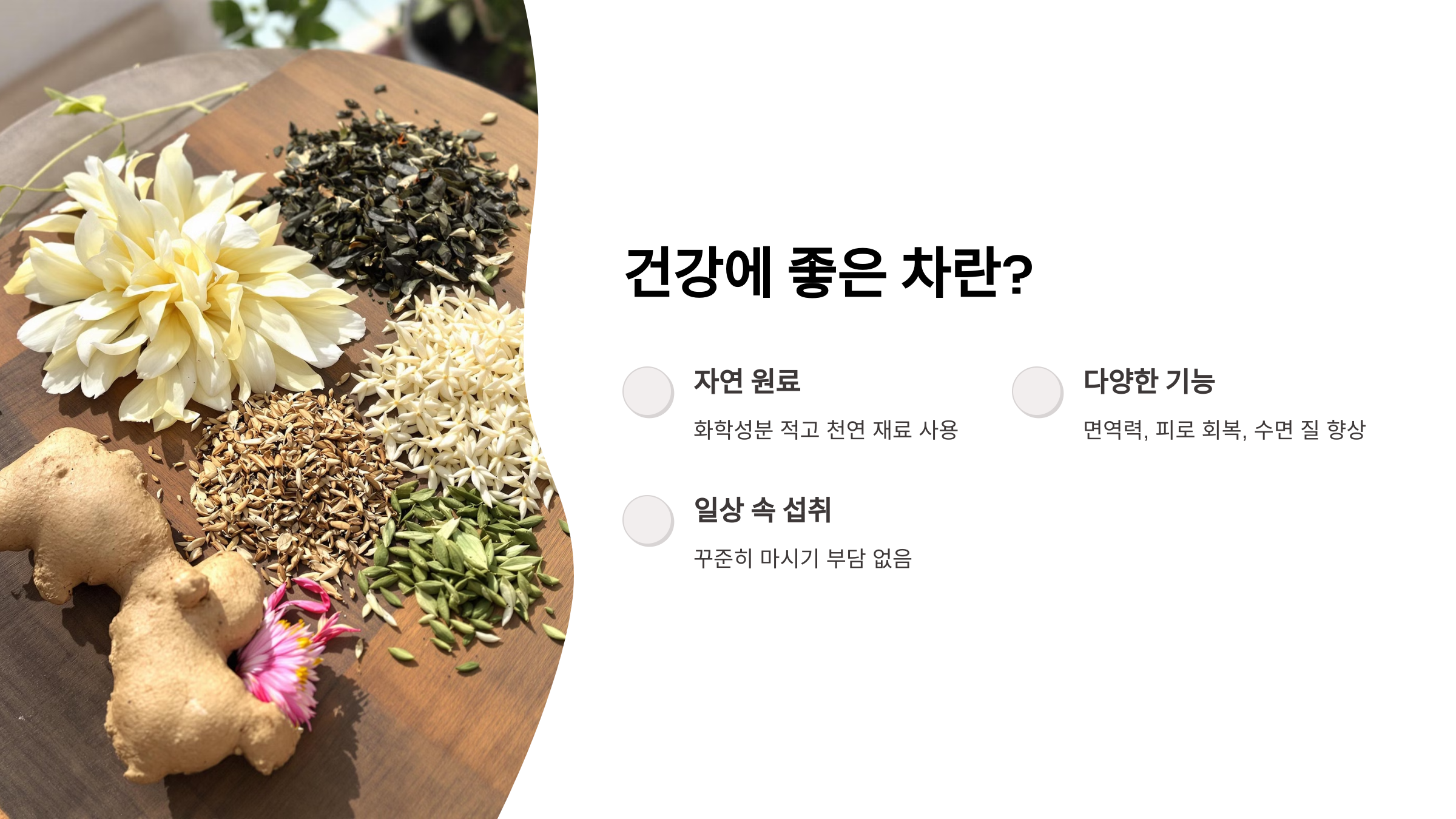 화학성분이 적고 천연 재료를 사용하는 것이 특징이며, 일상 속에서 쉽게 섭취할 수 있어 꾸준히 마시기에 부담이 없습니다.