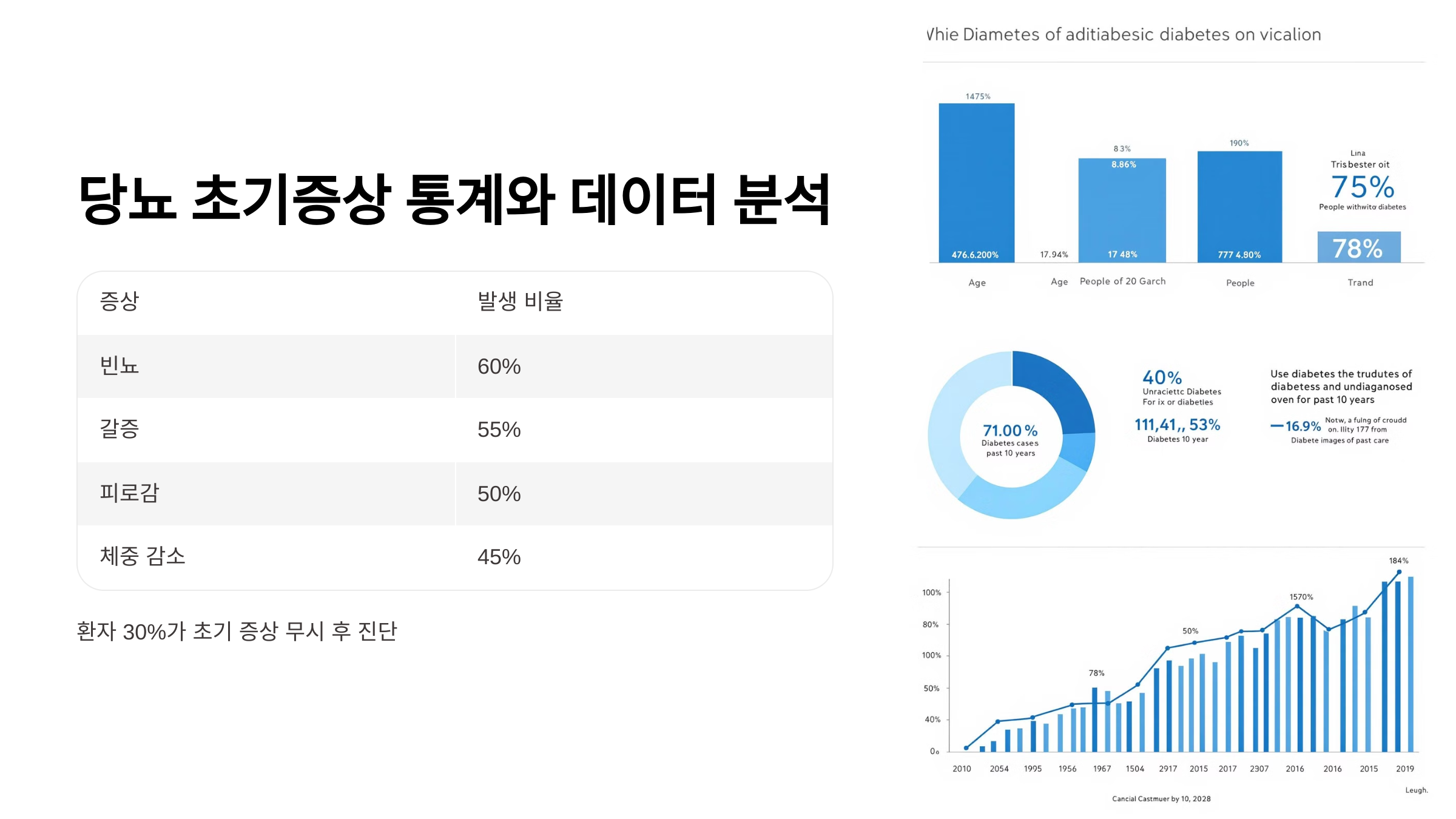 이러한 통계는 당뇨 초기증상을 조기에 발견하고 관리하는 것이 얼마나 중요한지를 보여줍니다. 증상이 나타나면 즉시 전문가의 상담을 받아야 합니다.